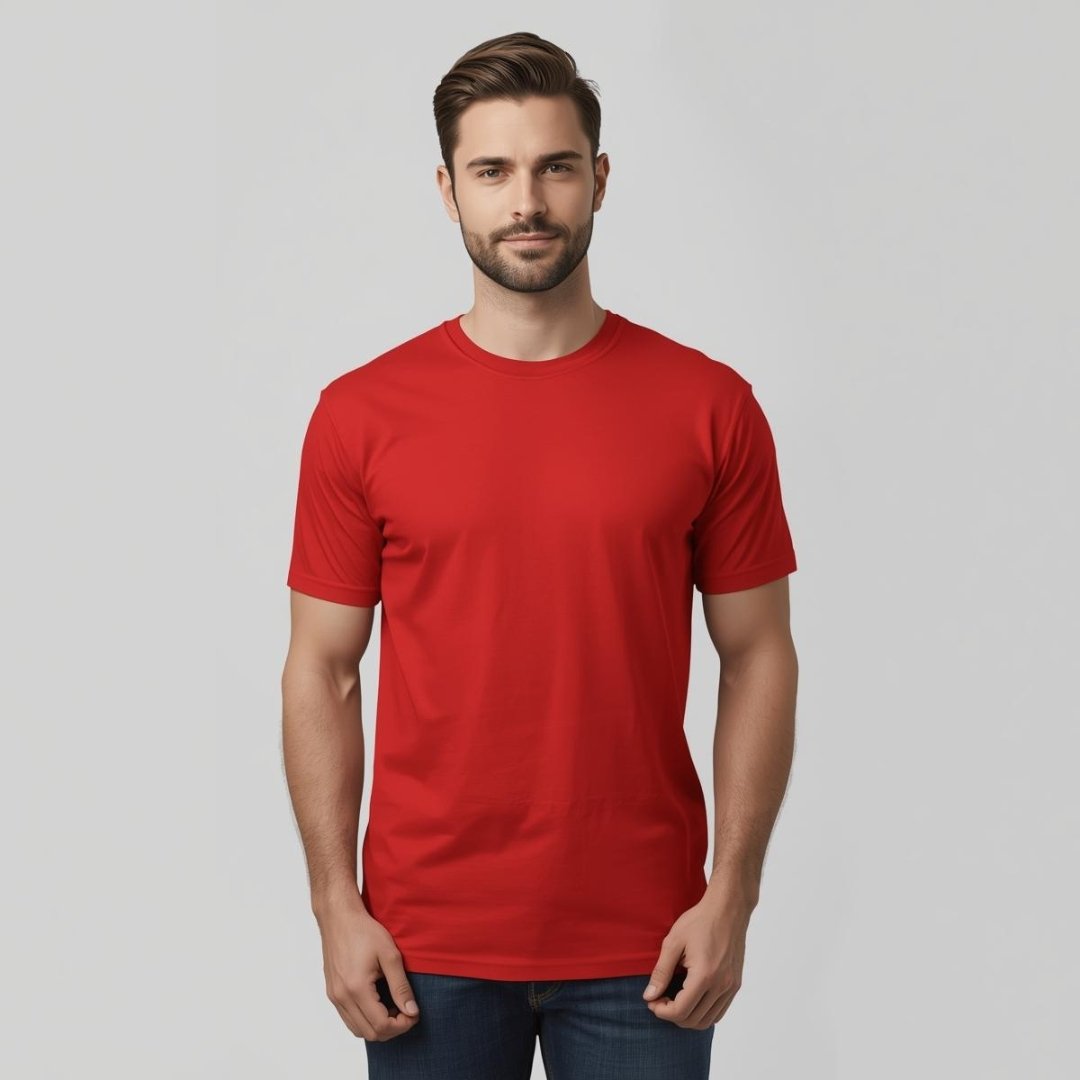Get this blank red t-shirt or get it customised with the designs you would love to get printed on it, which looks simple yet stylish at the same time. Made from pure cotton material, this t-shirt is suitable for both men and women, making it perfect for everyday use.