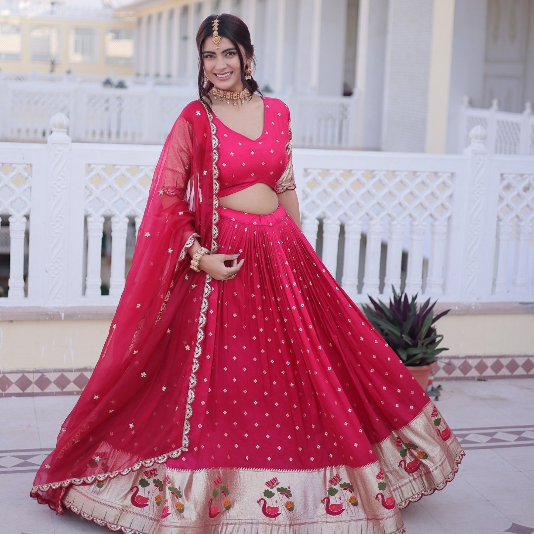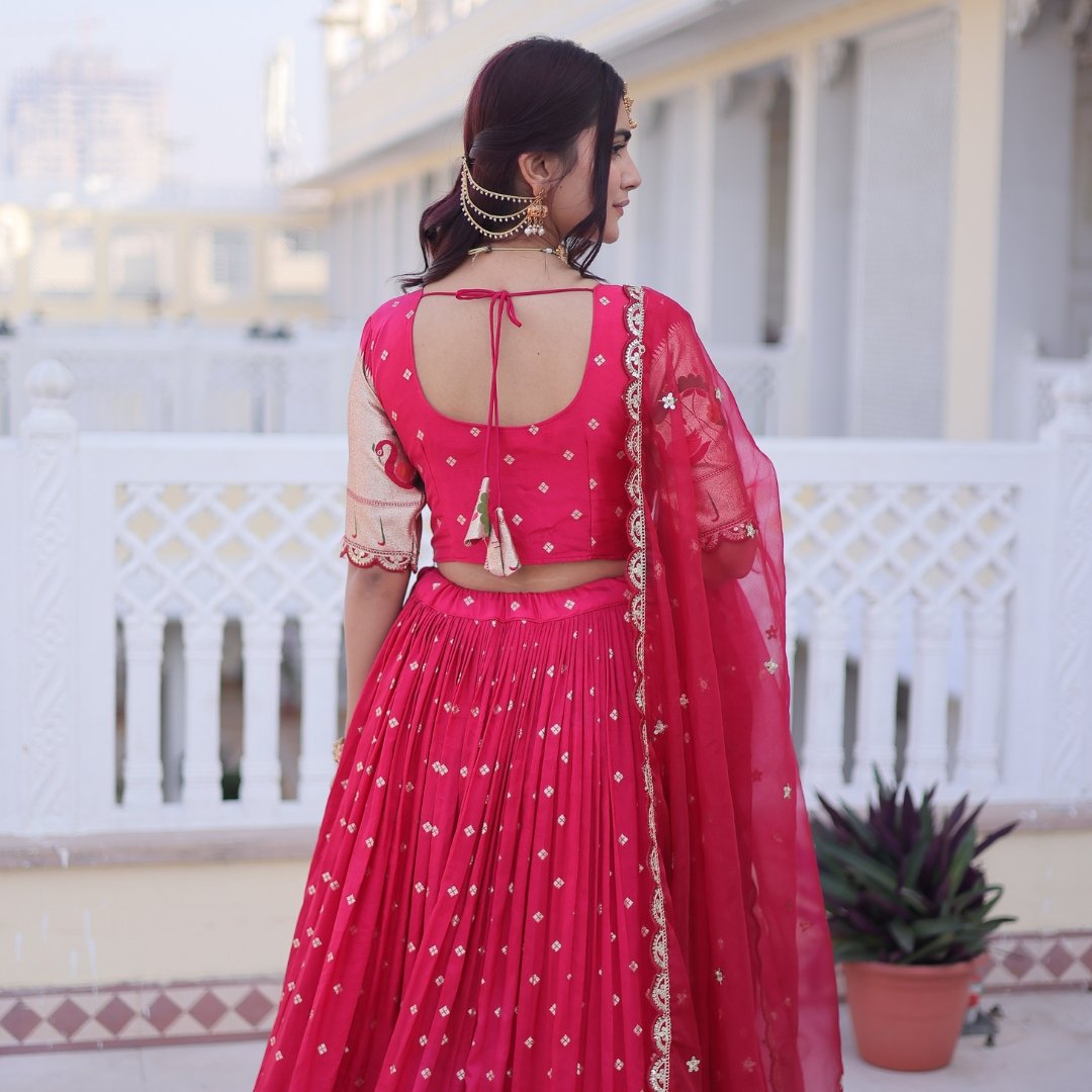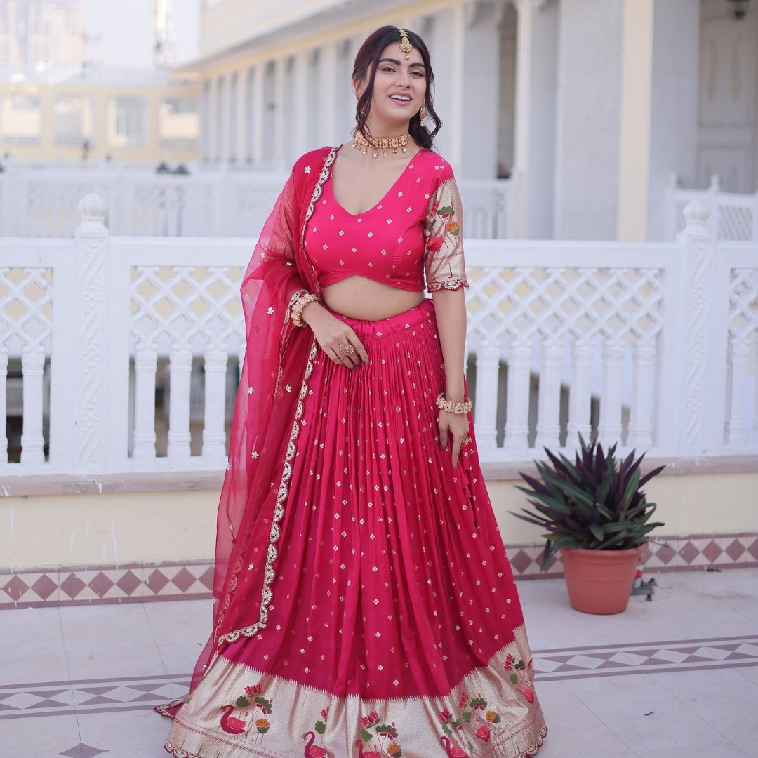 The vibrant pink hue is adorned with delicate golden polka embroidery, adds a subtle shimmer to every movement.Crafted from luxurious silk, the lehenga showcases exquisite zari, featuring intricate peacock motifs adds a different touch to the attire. Designed for comfort and sheer elegance, this combo looks great together. A perfect traditional look for weddings, sangeet nights, or any festive occasions.
