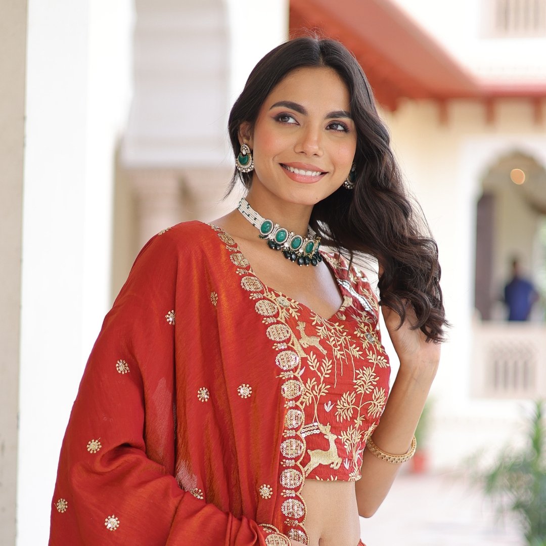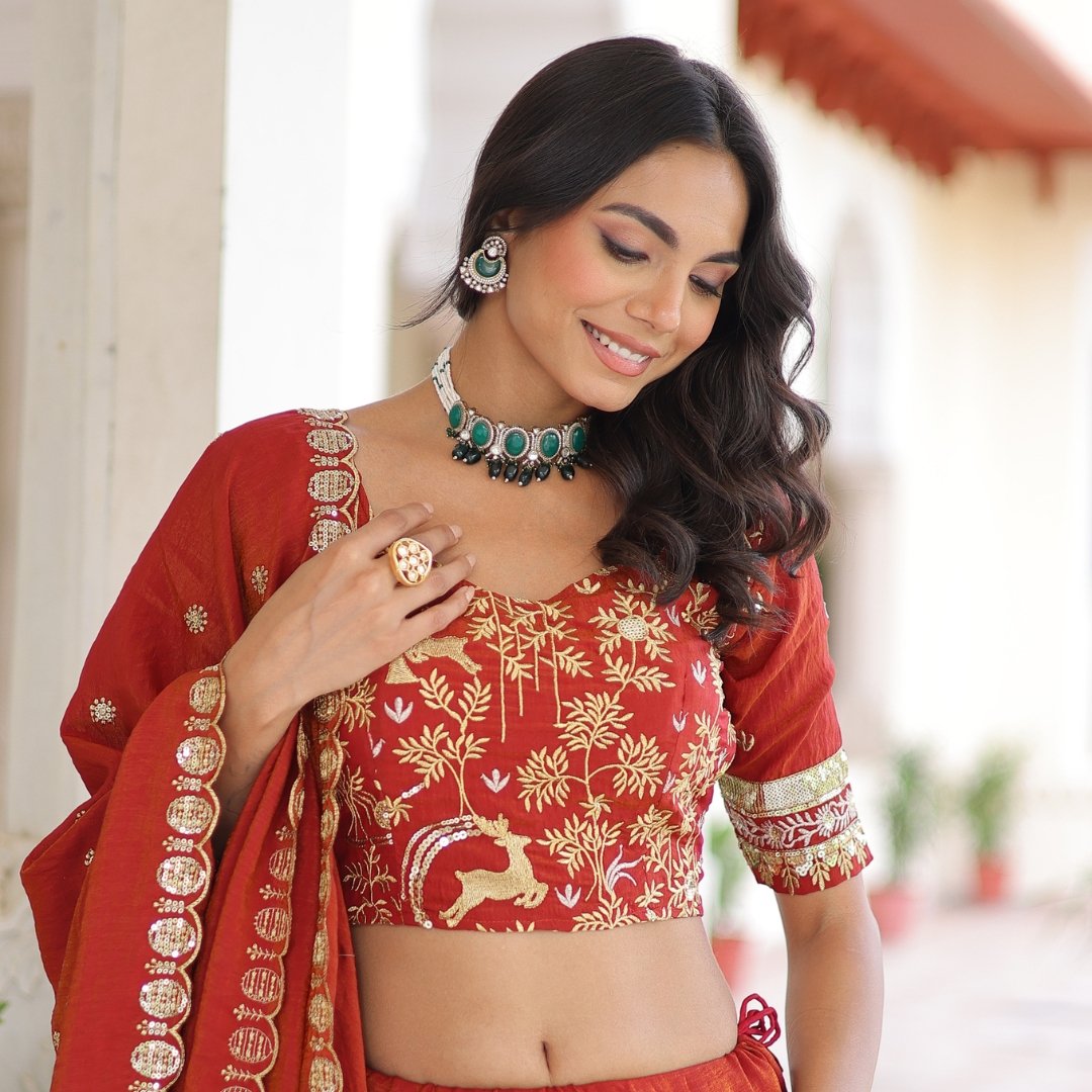 Crafted perfectly for festive and bridal occasions, this orange lehenga choli features golden threadwork with a matching dupatta completes the royal ensemble. Made from premium silk-blend fabric,is a perfect wear for weddings, receptions, or traditional celebrations.