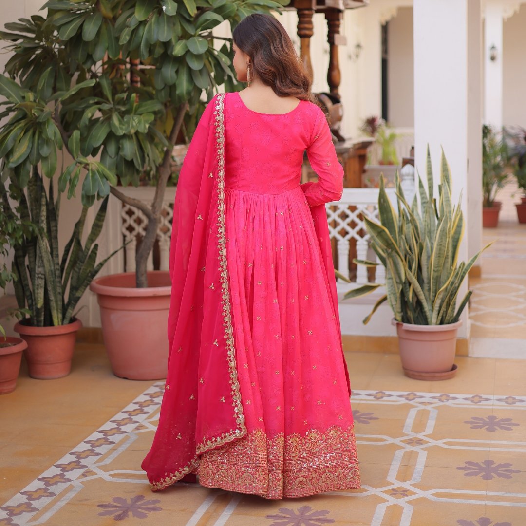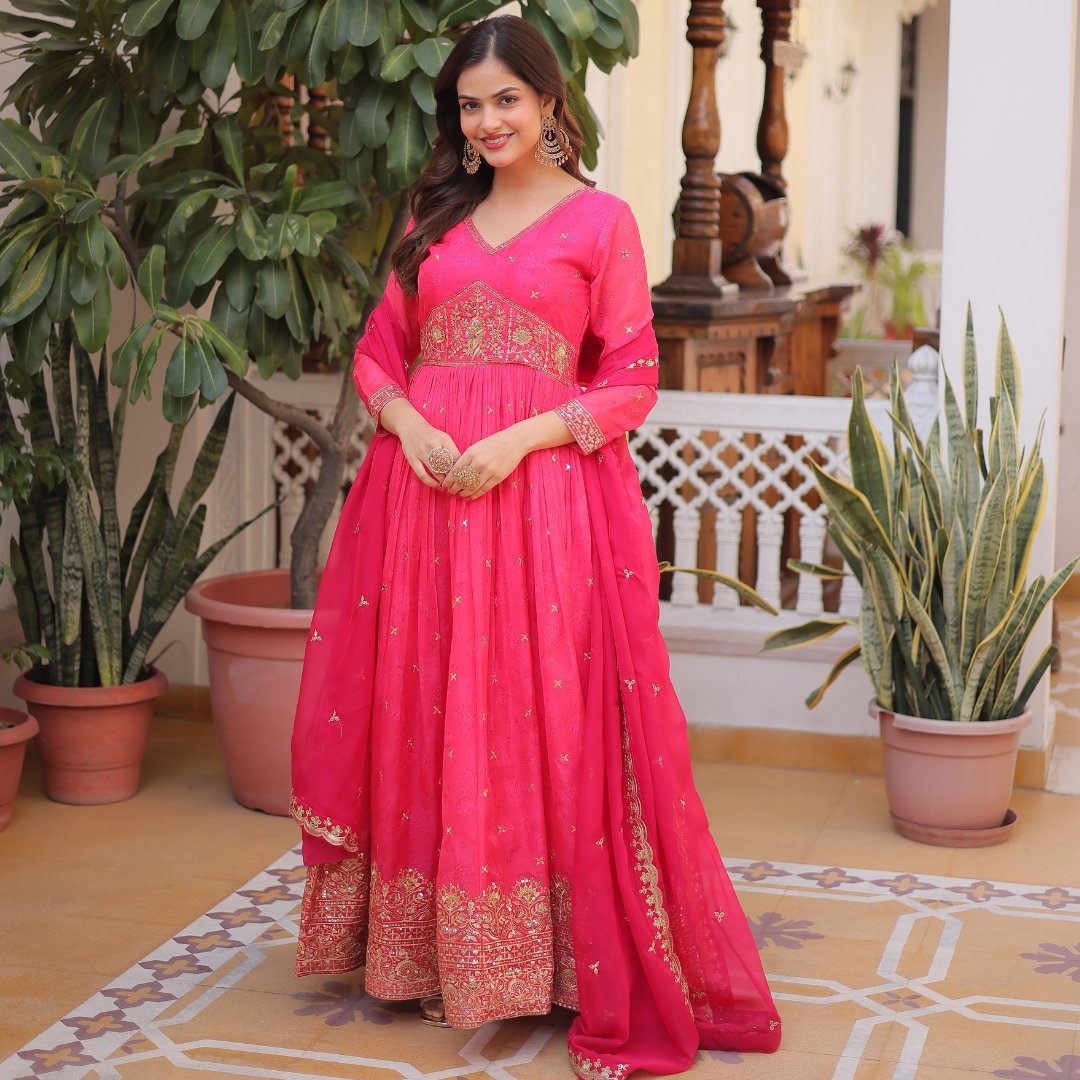 This radiant pink gown is designed to make every occasion a special one. The full-sleeved bodice with a flattering V-neckline enhances grace and movement. The matching dupatta, detailed with subtle embroidery, completes the look effortlessly. Pair it with gold jewelry and a sleek hairstyle for a picture-perfect festive outfit.