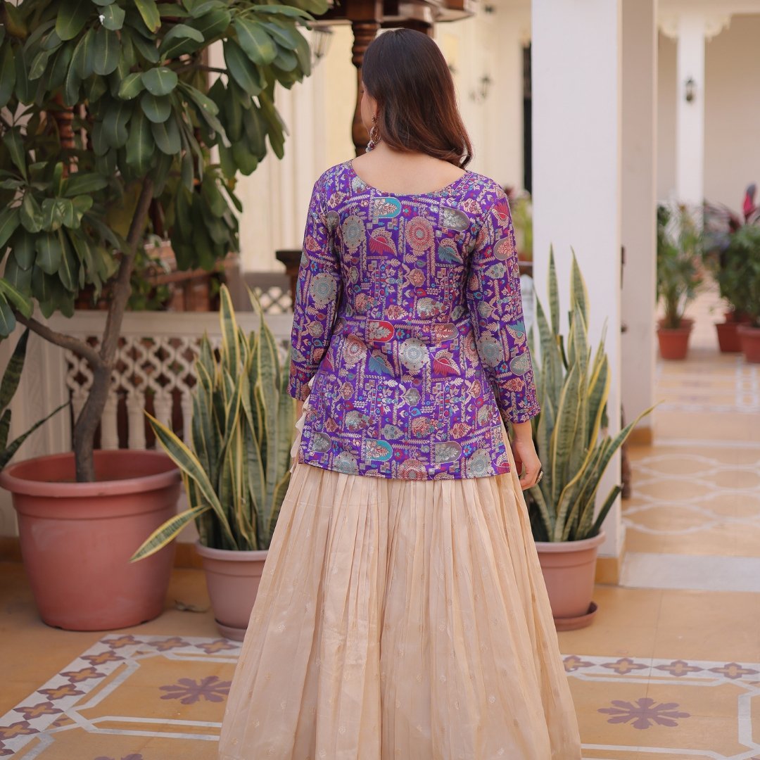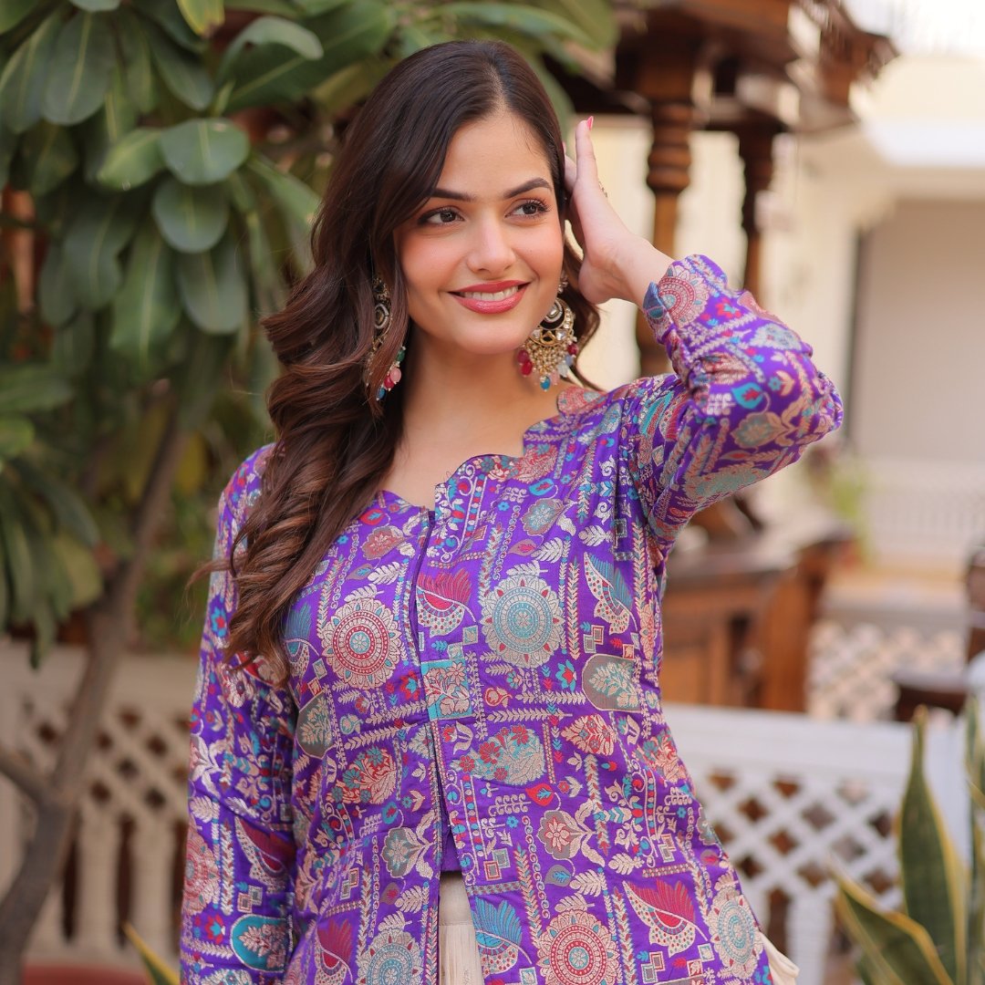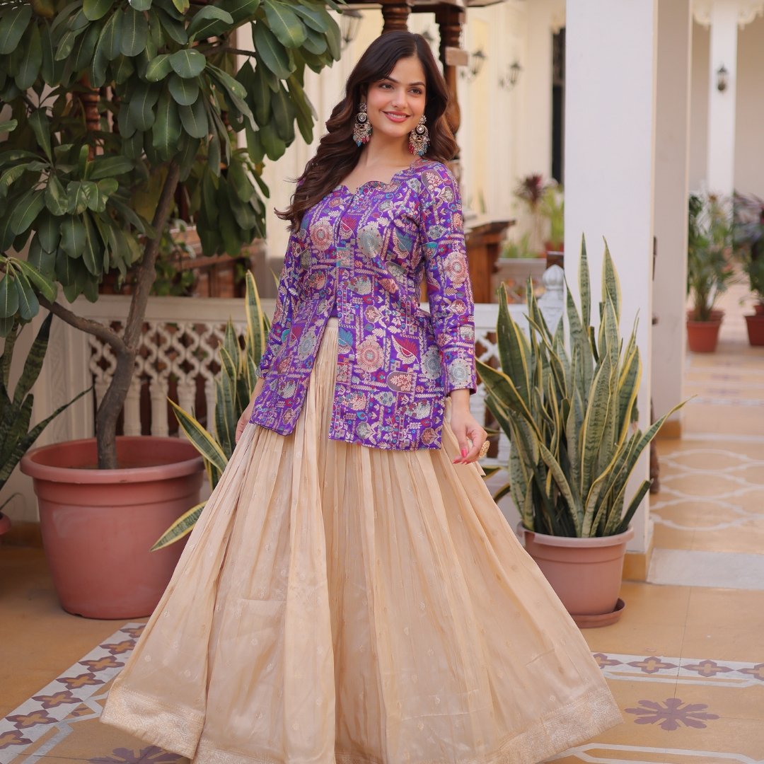 This stunning outfit featuring a rich looking purple jacket paired with a flowing beige skirt which creates a balanced and graceful silhouette. This outfit is perfect for weddings, festive and cultural events. Made with care and precision for a polished, contemporary ethnic look that stands out effortlessly.
